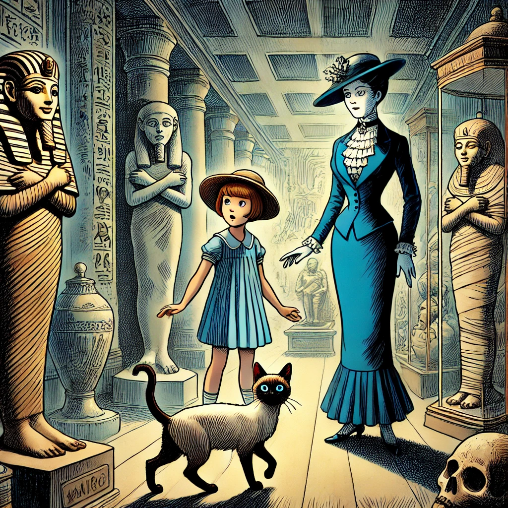 Y así, my dearest gentle readers, Paula regresó con sus papás, quienes la abrazaron aliviados y algo divertidos por su pequeña travesura. Pero Paula sabía que había vivido una aventura única, una que la conectaba de algún modo con el antiguo Egipto y con las historias que aún están por descubrirse en los rincones más oscuros del museo.